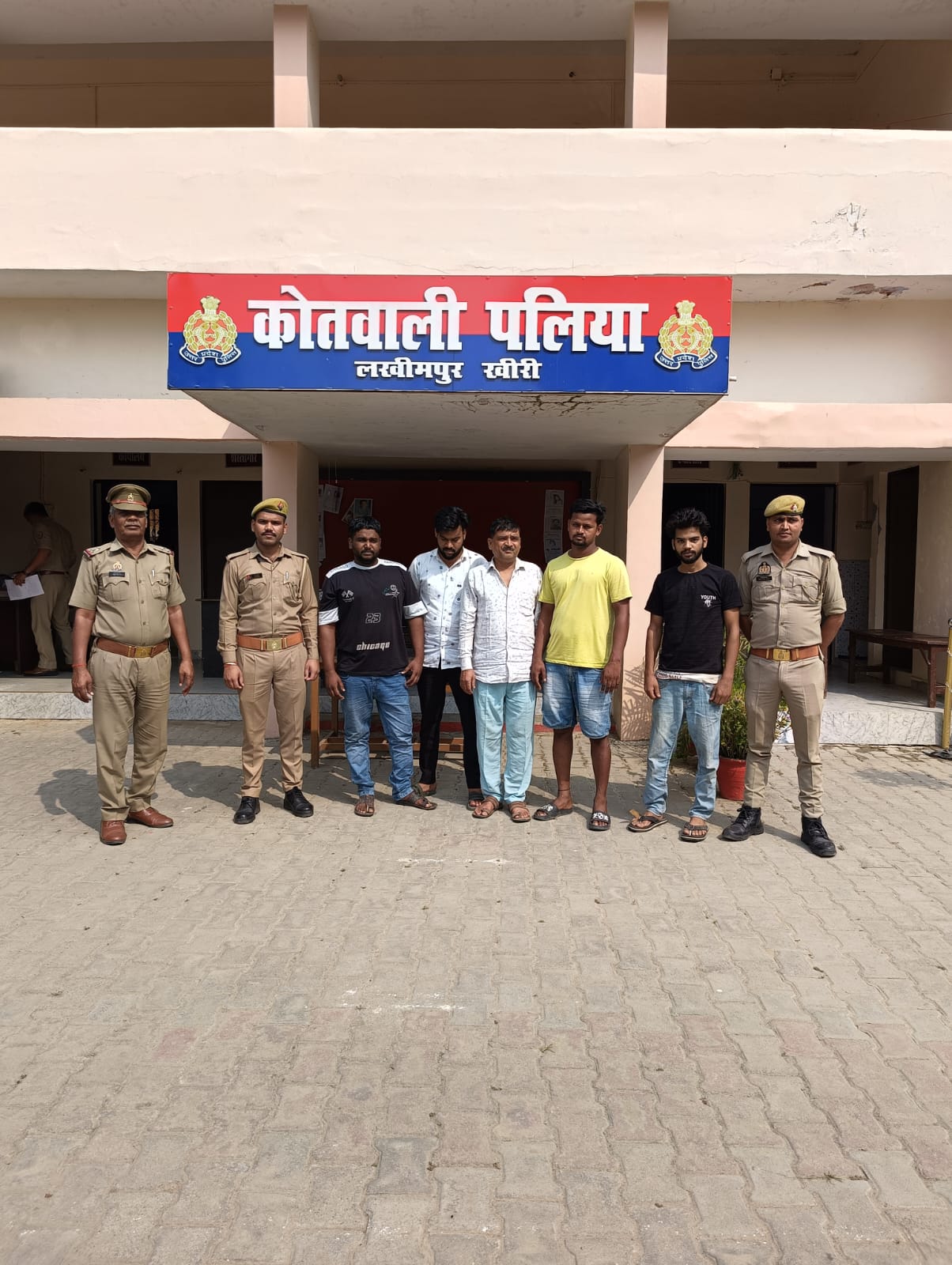 गिरफ्तार आरोपियों की पहचान आशुतोष वाल्मीकी पुत्र अशोक वाल्मीकी निवासी मो0 रंगरेजान प्रथम कस्बा व थाना पलिया जनपद खीरी, शेखर शाक्य पुत्र धनीराम शाक्य निवासी मो0 किसान द्वितीय कस्बा थाना पलिया जनपद खीरी, अभय चौधरी पुत्र नेतराम चौधरी निवासी बाजार प्रथम कस्बा व थाना पलिया जनपद खीरी, राज उर्फ रजा गुप्ता पुत्र रमाशंकर गुप्ता उर्फ रमाभगवान गुप्ता निवासी बाजार 1 कस्बा व थाना पलिया खीरी, अनिल कुमार वाल्मीकी पुत्र धुरईलाल वाल्मीकी निवासी मो0 रंगरेजान प्रथम कस्बा व थाना पलिया खीरी को विधिक कार्यवाही करते हुये न्यायालय भेजा गया।